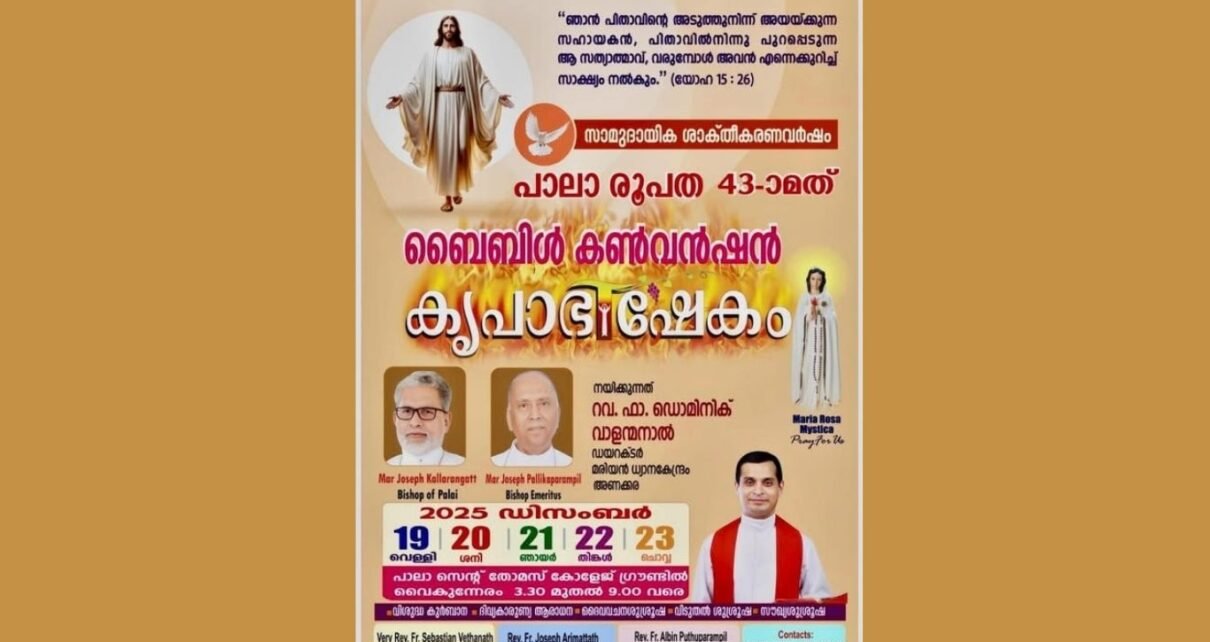 പാലാ : പാലാ രൂപത 43-ാമത് കൃപാഭിഷേകം ബൈബിള്കണ്വെന്ഷൻ പന്തലിൻ്റെ കാൽനാട്ടുകർമ്മം സെൻ്റ് തോമസ് കോളേജ് ഗ്രൗണ്ടിൽ നാളെ തിങ്കളാഴ്ച വൈകുന്നേരം 4 നു ബിഷപ്പ് മാർ.ജോസഫ് കല്ലറങ്ങാട്ട് നിർവഹിക്കും. പ്രോട്ടോസിഞ്ചെലൂസ്, വികാരി ജനറാളുമാർ, പ്രോക്യൂററ്റർ, ചാൻസലർ, രൂപതയിലെ വിവിധ സംഘടനാ ഡയറക്ടർമാർ, വിവിധ ഇടവക വികാരിമാർ, എന്നിവർ സന്നിഹിതരായിരിക്കും. തുടർന്ന് വൈകിട്ട് അഞ്ചുമണി മുതൽ കൺവൻഷൻ വിജയത്തിനായുള്ള ജെറിക്കോ പ്രാർത്ഥനയും ആരംഭിക്കും. ഡിസംബർ 01 മുതൽ 18 വരെ നടക്കുന്ന പ്രാർത്ഥനകൾക്ക് രൂപതയിലെ വിവിധ ഫൊറോനകളിൽ Read More…
