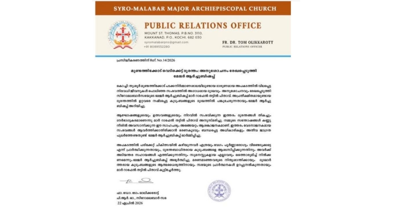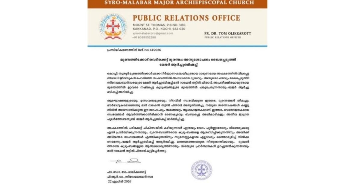 മരണമടഞ്ഞവരുടെ നിത്യശാന്തിക്കായും ദുഃഖാർ ത്തരായ കുടുംബങ്ങളുടെ ആത്മധൈര്യത്തിനായും സഭയുടെ പ്രാർത്ഥനകൾ ഉറപ്പുനൽകുന്നതായും മാർ റാഫേൽ തട്ടിൽ പിതാവ് കൂട്ടിച്ചേർത്തു.