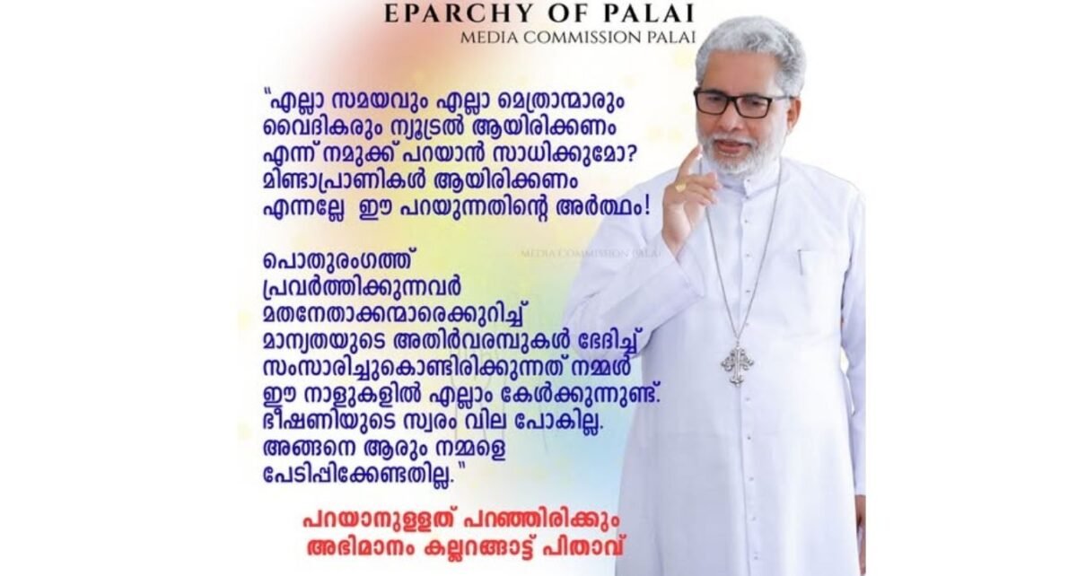 എല്ലാ സമയവും എല്ലാ മെത്രാന്മാരും വൈദികരും ന്യൂട്രൽ ആയിരിക്കണം എന്ന് നമുക്ക് പറയാൻ സാധിക്കുമോ? മിണ്ടാപ്രാണികൾ ആയിരിക്കണം എന്നല്ലേ ഈ പറയുന്നതിന്റെ അർത്ഥം എന്ന് പിതാവ് ചോദിച്ചു. രഹസ്യമായിട്ടല്ല, പരസ്യമായിട്ടുതന്നെ വോട്ടു ചോദിയ്ക്കാൻ നമുക്ക് അവകാശമില്ലേയെന്നും, ആരെയാണ് പേടിക്കേണ്ടതെന്നും കല്ലറങ്ങാട്ട് പിതാവ് ചോദിച്ചു. ഭീഷണിയുടെ സ്വരം വില പോകില്ല. അങ്ങനെ ആരും നമ്മളെ പേടിപ്പിക്കേണ്ടതില്ല എന്നും കല്ലറങ്ങാട്ട് പിതാവ് പറഞ്ഞു.