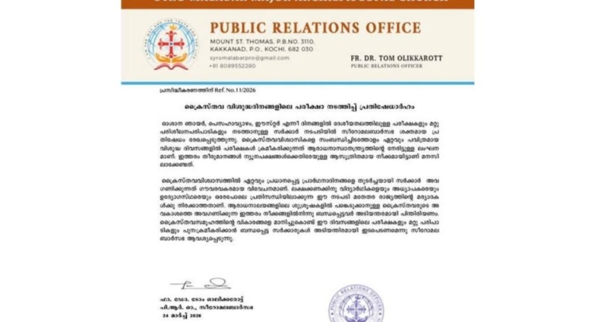 ഓശാന ഞായർ, പെസഹാവ്യാഴം, ഈസ്റ്റർ എന്നീ ദിനങ്ങളിൽ ദേശീയതലത്തിലുള്ള പരീക്ഷകളും മറ്റു പരിശീലനപരിപാടികളും നടത്താനുള്ള സർക്കാർ നടപടിയിൽ സീറോമലബാർ സഭ ശക്തമായ പ്ര തിഷേധം രേഖപ്പെടുത്തുന്നു.